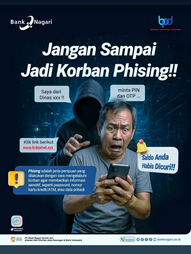 Bank Nagari Sawahlunto Ingatkan Warga Waspada Phishing, Kacab Ulfadli: Jangan Pernah Berikan PIN dan OTP.Ulfardhi menegaskan, pelaku phishing umumnya menggunakan berbagai cara untuk mengelabui korban, seperti mengaku dari dinas tertentu, pihak bank, atau lembaga resmi lainnya, hingga mengirimkan tautan mencurigakan dan meminta data pribadi.