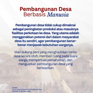 “Pembangunan desa berbasis manusia menempatkan warga sebagai aktor utama. Nilai, kearifan lokal, serta budaya desa menjadi fondasi dalam merancang kebijakan yang benar-benar menjawab kebutuhan riil masyarakat,” demikian disampaikan dalam materi informasi resmi Kemendes PDT.