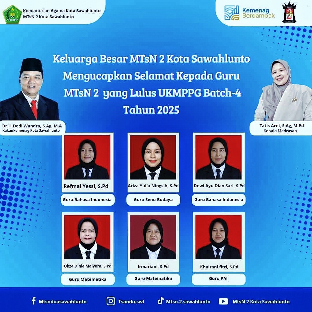 “Selamat dan sukses kepada guru-guru MTsN 2 Kota Sawahlunto yang telah lulus UKMPPG Batch 4. Semoga amanah dalam mengemban tugas sebagai guru profesional dapat dijalankan dengan penuh dedikasi dan integritas.” (Ris1)