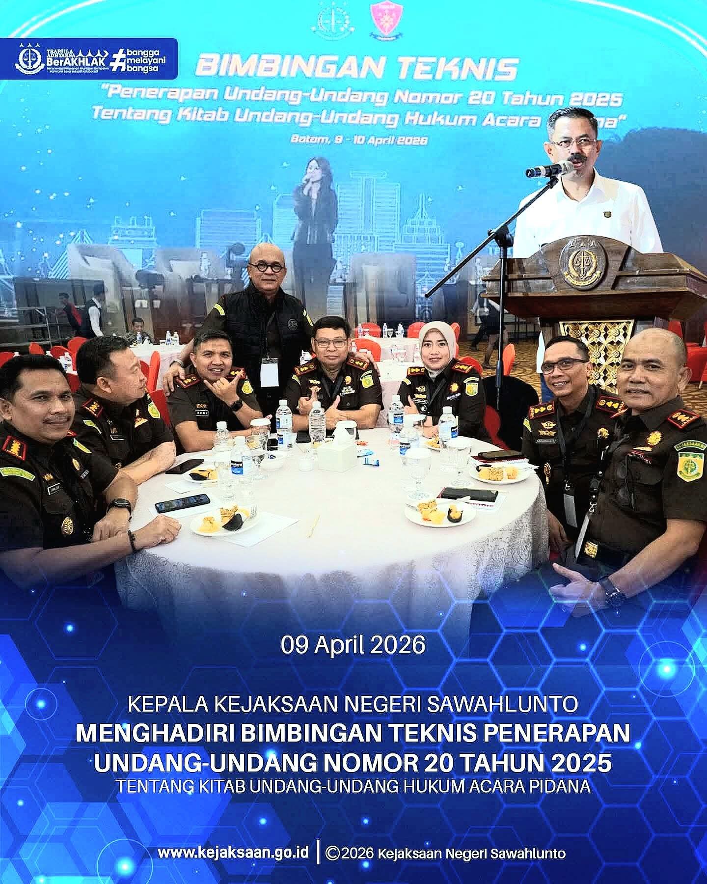 BATAM, Targetonlinenews.com – Kepala Kejaksaan Negeri (Kajari) Sawahlunto, Eddy Samrah L., S.H., M.H., menghadiri kegiatan Bimbingan Teknis (Bimtek) Penerapan Undang-Undang Nomor 20 Tahun 2025 tentang Kitab Undang-Undang Hukum Acara Pidana (KUHAP) yang digelar pada Kamis, 9 April 2026, pukul 07.30 WIB di Swiss-Belhotel Harbour Bay, Batam.