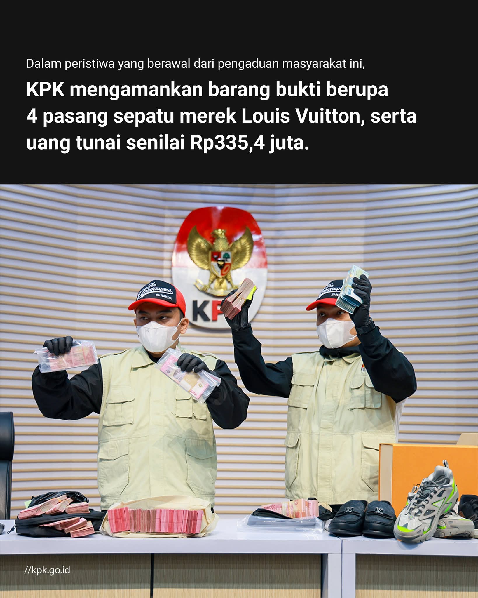 Dalam operasi tangkap tangan tersebut, KPK mengamankan sejumlah barang bukti, antara lain beberapa pasang sepatu bermerek Louis Vuitton serta uang tunai senilai Rp335,4 juta yang diduga terkait dengan praktik pemerasan tersebut.