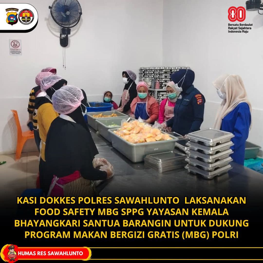 Pada kesempatan tersebut, PS. Kasi Dokkes Polres Sawahlunto, Aiptu Yuli Erwati, BAmd Kep, memimpin langsung kegiatan Food Safety di Yayasan Kemala Bhayangkari Santua, Kecamatan Barangin, Kota Sawahlunto, Selasa (7/10/25) Kegiatan ini merupakan bagian dari pelaksanaan program Satuan Pelayanan Pemenuhan Gizi (SPPG) Polri, yang sejalan dengan komitmen Polri dalam mendukung kebijakan nasional peningkatan gizi masyarakat, khususnya anak-anak usia sekolah.