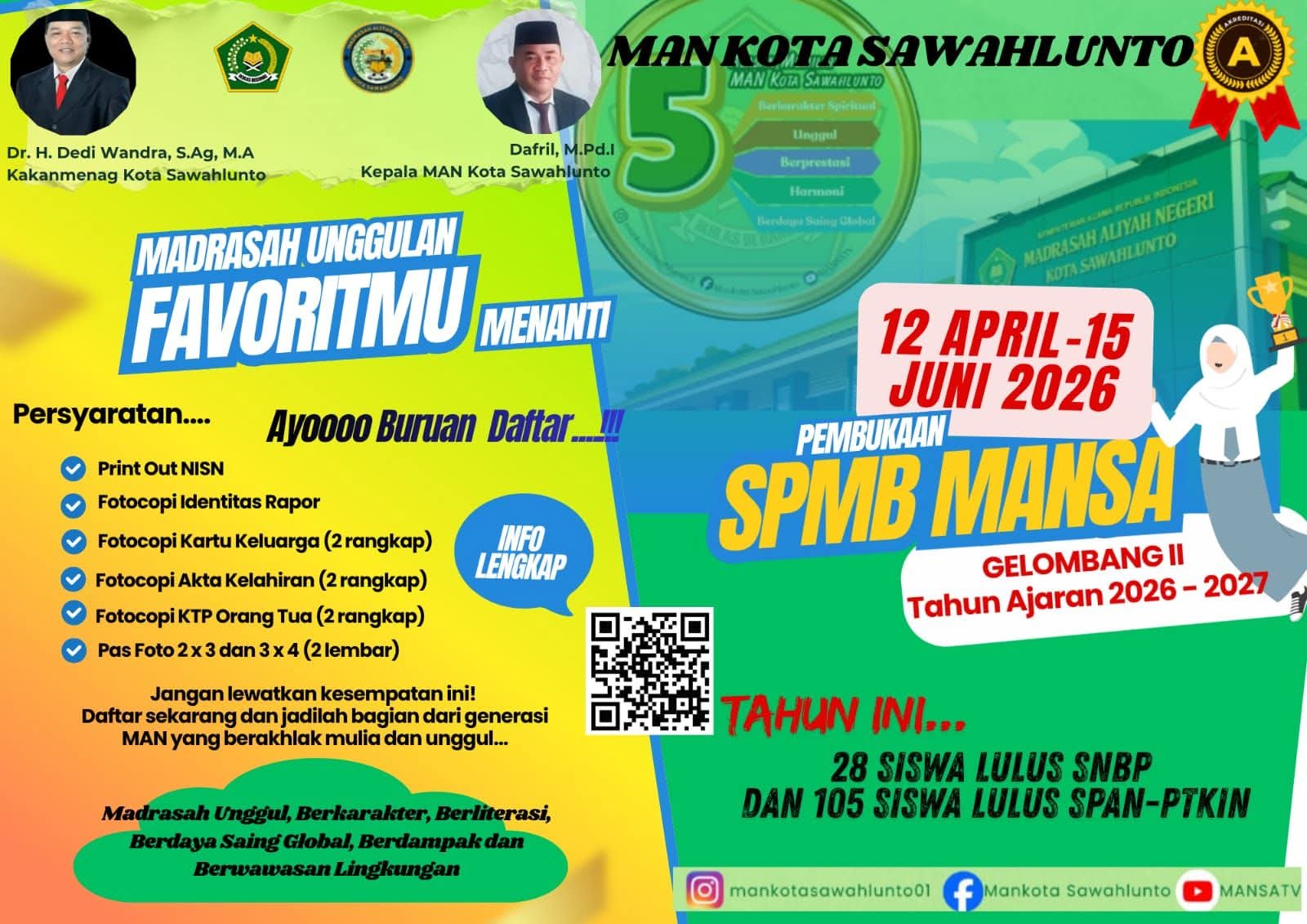 SPMB Gelombang II Dibuka, MAN Kota Sawahlunto Ajak Lulusan SMP/MTs Segera Mendaftar. Kepala MAN Kota Sawahlunto, Dafril, M.Pd.I, mengajak para orang tua untuk mempercayakan pendidikan dan pembentukan karakter anak kepada MAN Sawahlunto yang telah dikenal sebagai madrasah unggul dan berprestasi.